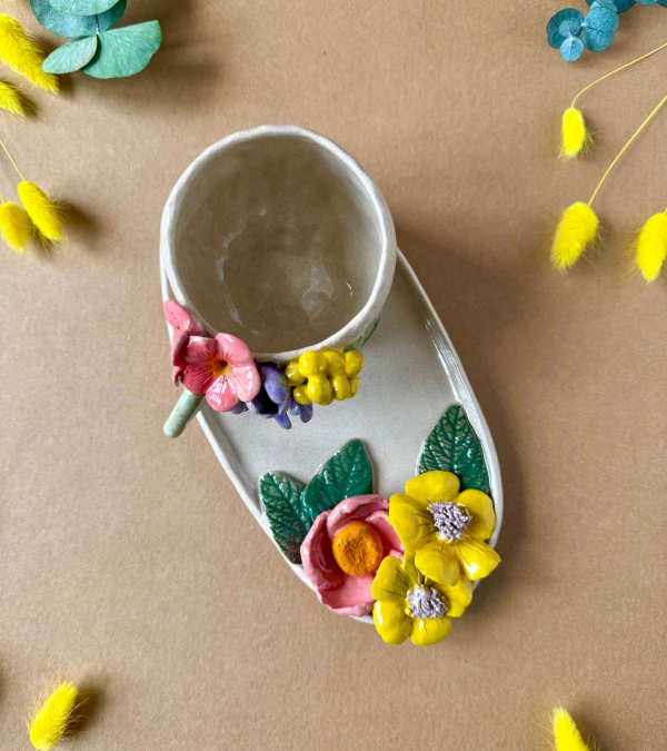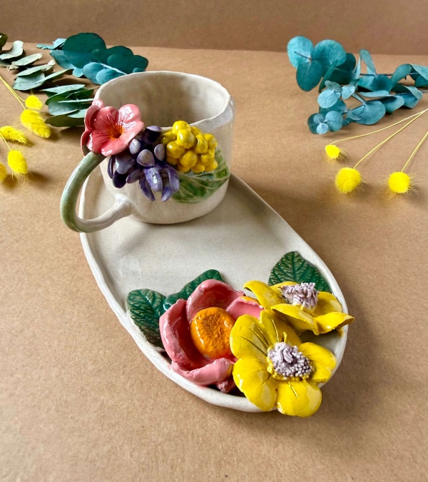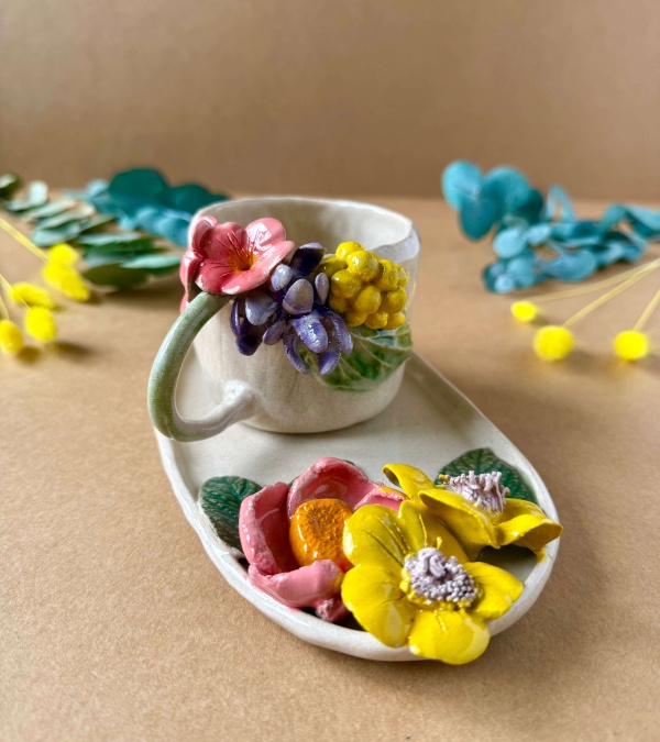 Coffee Mug Set with Colorful Flowers - Oval Plate