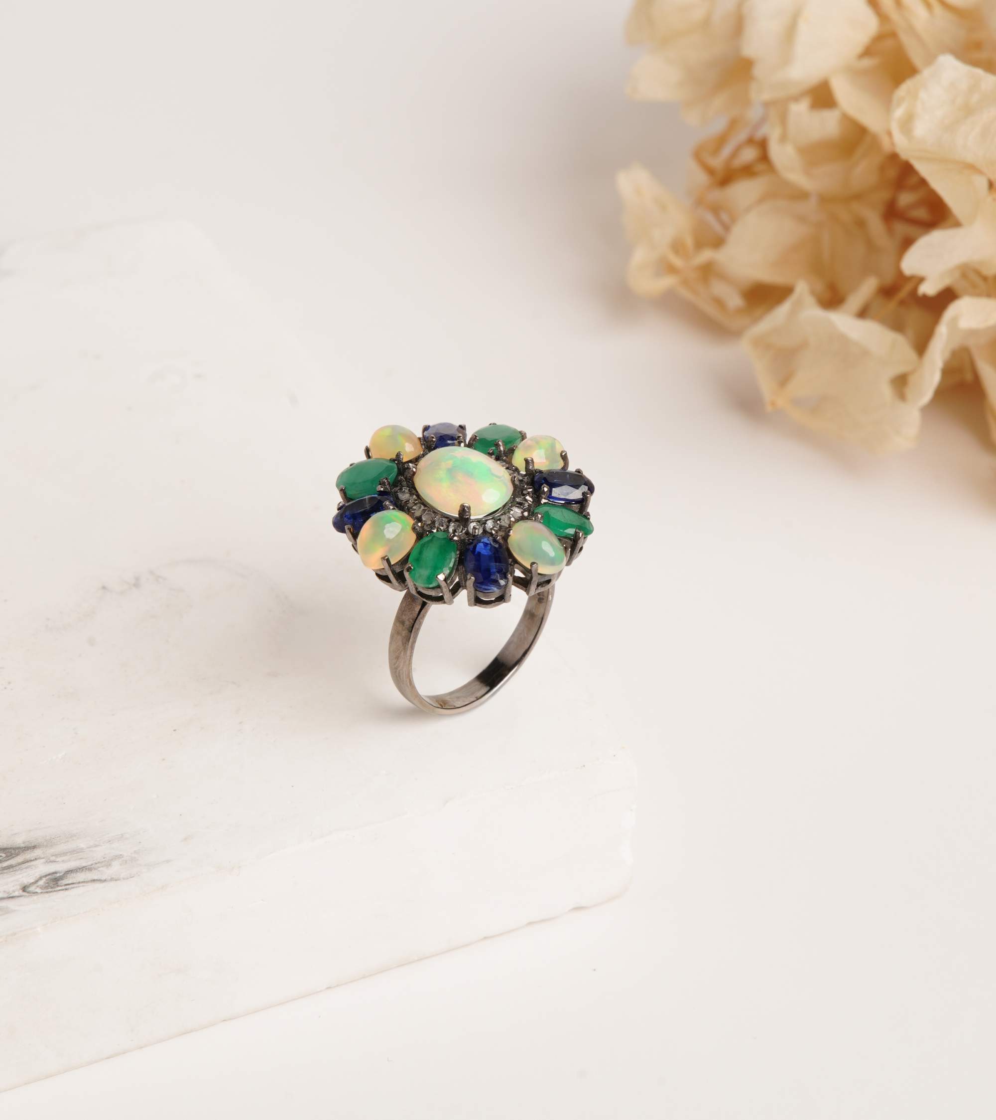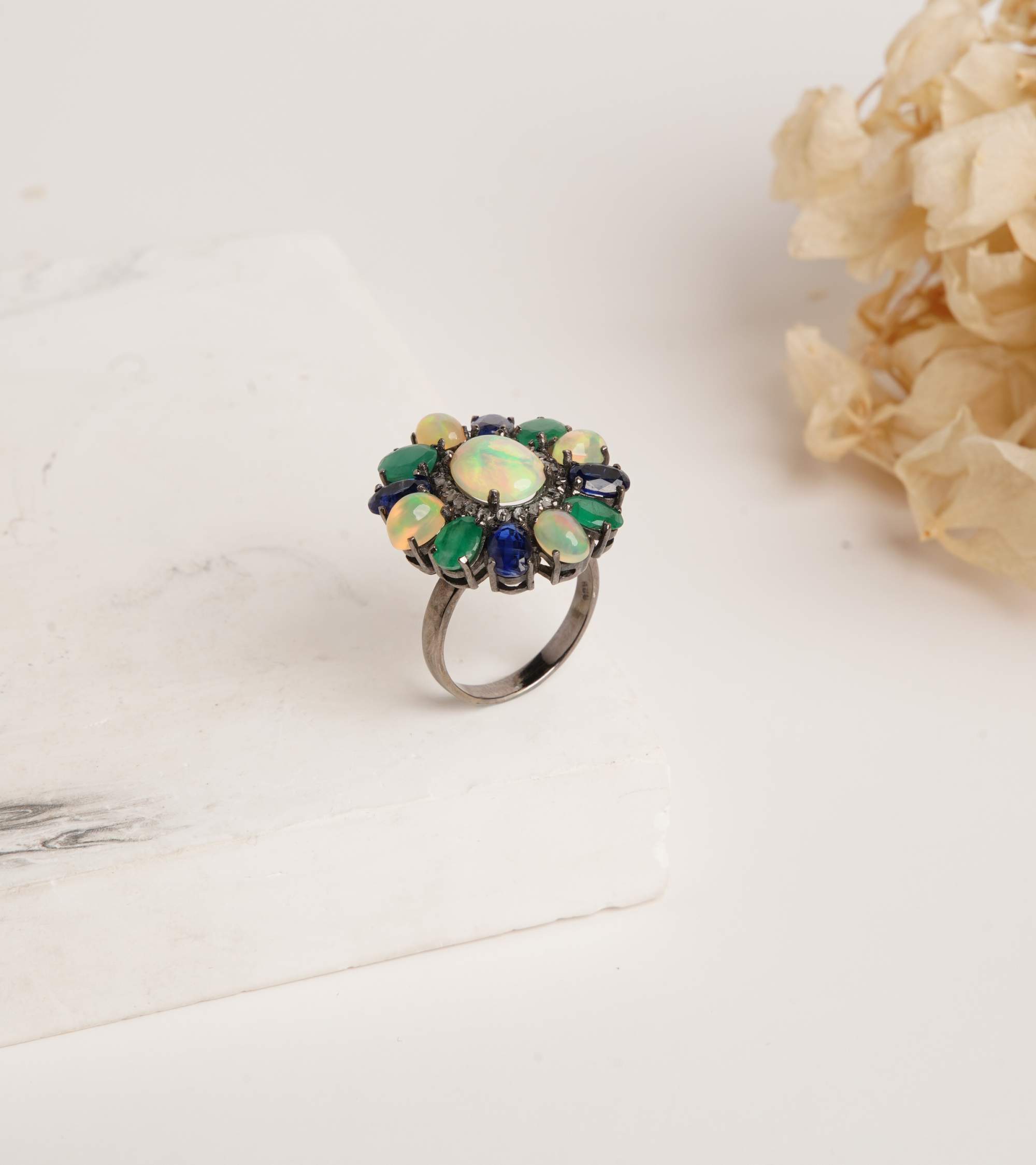 Raw Diamond Silver Ring with Opal, Emerald, Sapphire