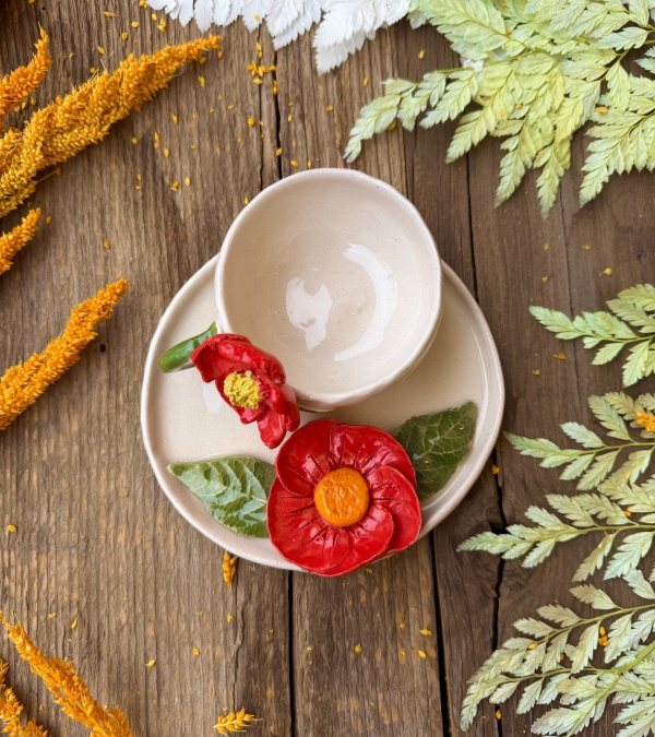 Turkish Coffee Cup Set with Red Flowers